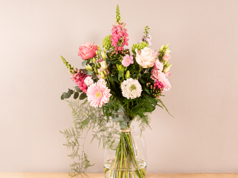 Stijlvol boeket in roze- en pasteltinten. Losjes geschikt met speels groen, en hoogteverschil.