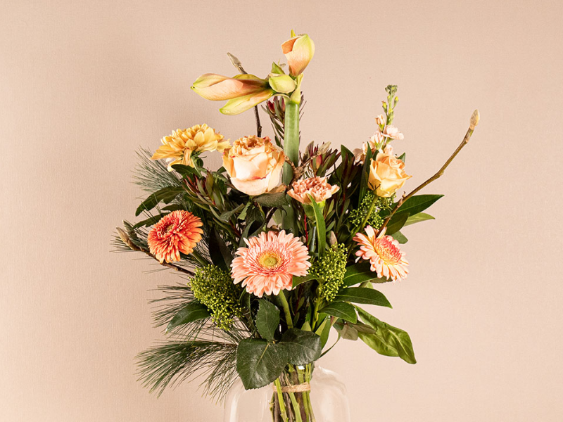 Stijlvol boeket in zalm en roze tinten voor een elegante en zachte uitstraling.