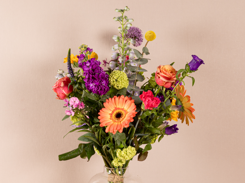 Vrolijk plukboeket in frisse tinten, losjes geschikt met speels groen en hoogteverschil.